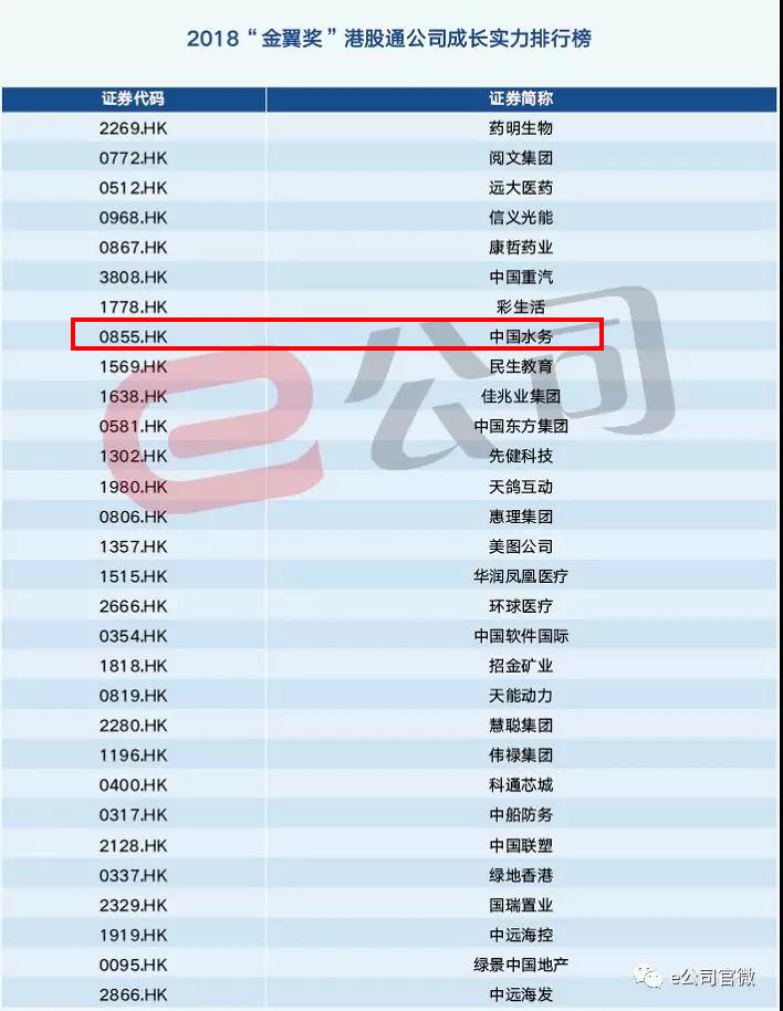 中國水務榮登2018“金翼獎”港股通公司成長實力榜